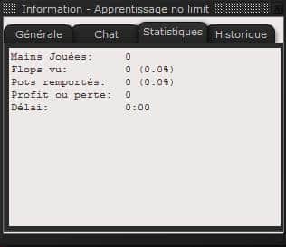 Statistiques – ce menu affiche les statistiques de base, notamment le nombre de mains que vous avez jouées, flops vus, et les pots gagnés.